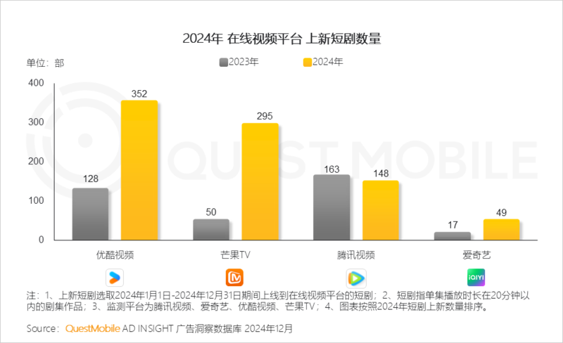 而短剧的崛起,带来了短剧APP快速增长,也让在线视频玩家快速增加短剧的数量、打造精品短剧厂牌。整个2024年,优酷视频、芒果TV、腾讯视频、爱奇艺上新短剧数量分别达到352部、295部、148部、49部。
