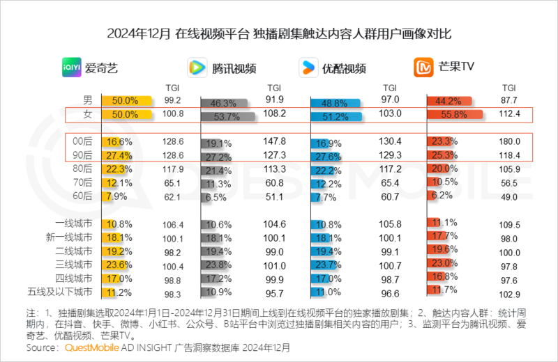 其中,腾讯视频和芒果TV的会员内容带动平台年轻用户的增长,而爱奇艺和优酷视频对25-40岁群体的吸引更强。