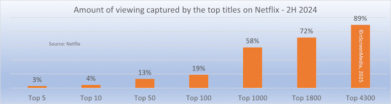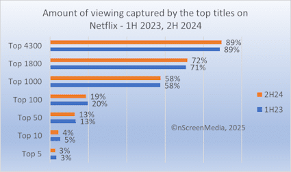 换个角度看,2024年下半年前26%的节目占了60%的观看时间。这必然意味着节目目录中排名最末的74%的节目只占据了40%的观看时间。这与2023年上半年相比有了很大的变化,当时排名前10%的节目吸引了71%的观看时间。