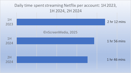 然而,看看普通账户的平均流量就能描绘出一幅不同的画面。Netflix有平均2.35亿订阅者在2023年上半年。每个账户每天播放2小时12分钟。2024年下半年的平均用户数量增加了23%,达到2.9亿(主要是由于密码共享限制的实施)。然而,每个用户的流媒体时间比2023年上半年低20%,每天1小时46分钟。所以,这就是为什么Netflix只笼统地谈论人们使用这项服务的时间。