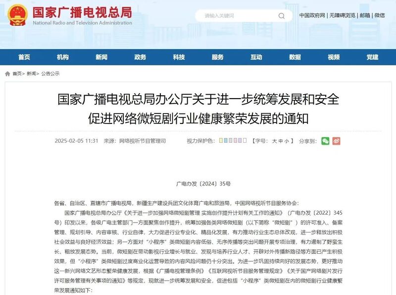 近日,广电总局配套发布了《国家广播电视总局办公厅关于进一步统筹发展和安全促进网络微短剧行业健康繁荣发展的通知》。