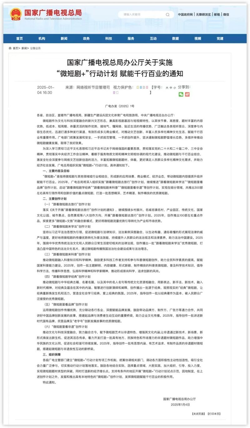 2025年初,广电总局进一步升级发布了《关于实施“微短剧+”行动计划赋能千行百业的通知》,深入实施“跟着微短剧去旅行”“跟着微短剧来学法”“跟着微短剧学经典”“跟着微短剧来科普”“微短剧里看品牌”以及“微短剧里看非遗”六大创作计划。