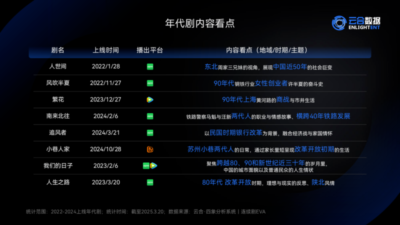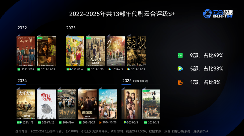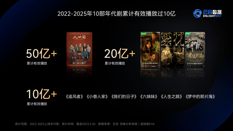 随着爱奇艺年代剧《北上》高热收官,市场的关注度和讨论度再次聚焦到年代剧。日前,第三方云合数据发布了《专题| 2022-2025年代剧网播观察》,显示近年来由爱奇艺打造的多部精品年代剧在云合S+评级、有效播放量表现、题材类型、荣誉获奖等各方面优势明显,领跑行业。