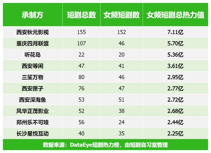 2024年西安秋元影视上榜了155部短剧,其中152部女频,3部男频,女频短剧总热力值约7.11亿。