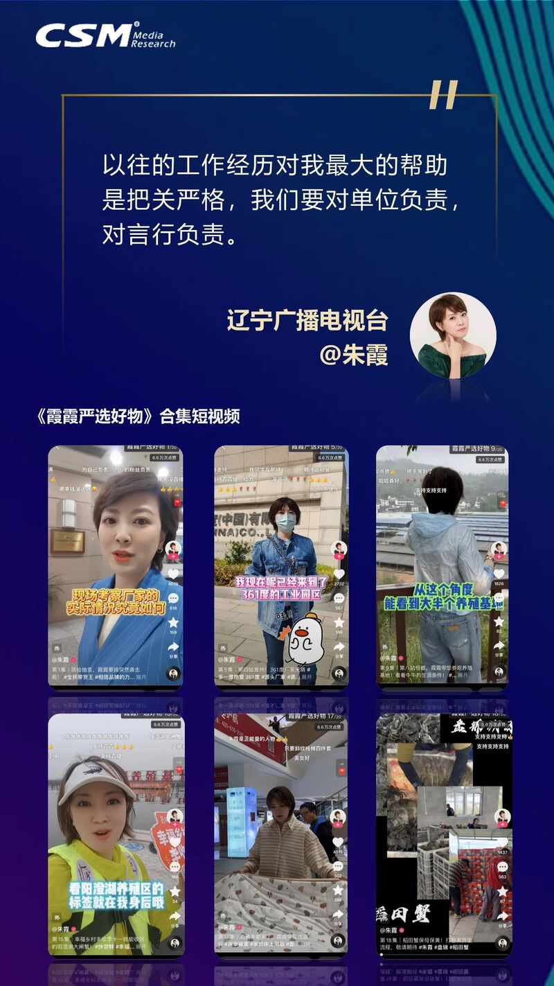 直播带货则是另一激烈的竞技场。融媒主播的带货逻辑与商业达人存在本质差异。媒体人的“底线思维”与部分网红达人形成鲜明对比。在人货场的商业框架里,“人”远远比产品、渠道更重要,底层逻辑并非流量,而是“信任”,融媒主播凭借长期专业内容积累的“人设信任”,将用户决策路径缩短至“信任-购买”。如辽宁台@朱霞,作为一个经营者在直播带货的前期严格选品,同时身为一个媒体人对每一个商品均要经过查询大量资料以保证全面的了解。