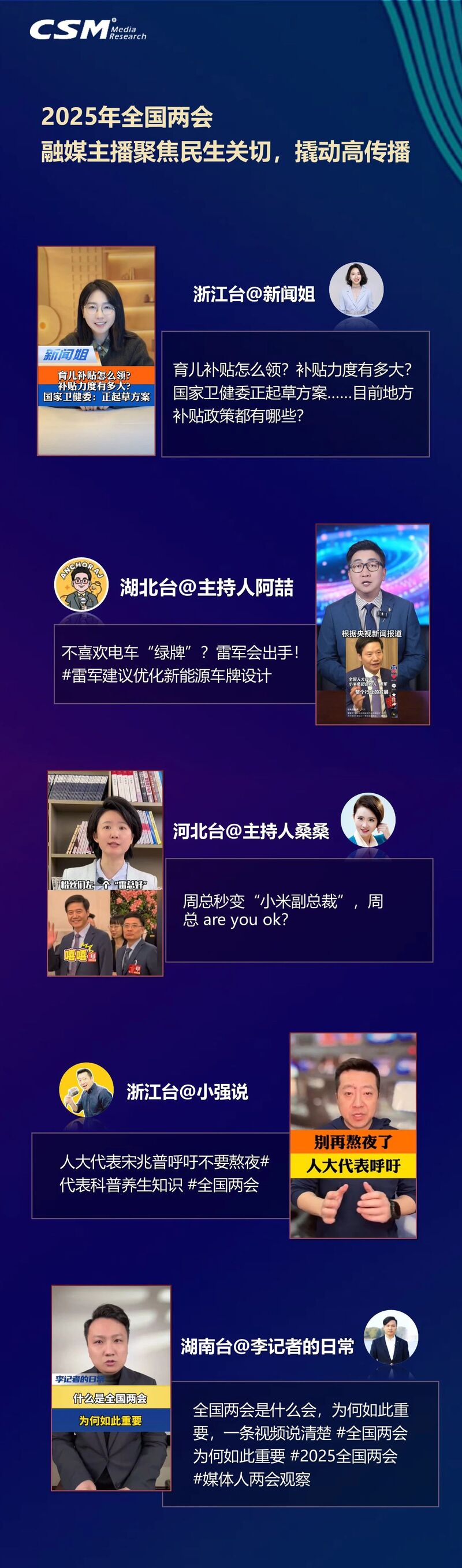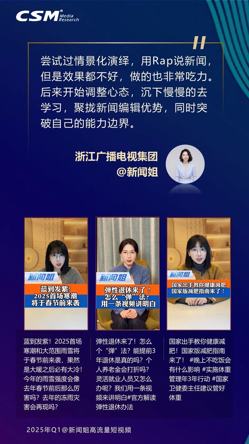 2025年全国两会期间,融媒主播系民生、接热梗,围绕重大主题,书写责任担当,聚焦民生关切撬动高传播。CSM数据显示:全国两会相关短视频传播量前五名的主播,发布的两会相关内容,总传播量近2亿;其中传播量超百万的内容数量,贡献融媒主播整体全国两会相关百万+内容的近三成。他们从不同视角切入,多维关注两会经济、民生等核心议题。其中,浙江台@新闻姐解码民生热词、以完整的背景介绍与详实的内容盘点全国多地政策;湖北台@主持人阿喆以民生议题和代表委员风采构建两会内容传播双“核心”;河北台@主持人桑桑紧扣网友热议与网络热梗,通过双梗叠加形成传播爆点,同时关注两会记者的敬业与专业。浙江台@小强说将政策导向与民生关切有机融合,凸显内容的实用性与知识性;湖南台@李记者的日常深度解读代表委员建言,同时以“速懂”内容,帮助公众快速了解全国两会。