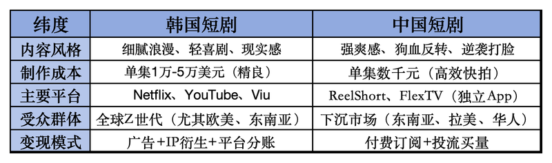 中国短剧和韩国短剧在海外市场的竞争日益激烈,两者在题材、制作模式、受众定位和商业化路径上既有相似之处,也有显著差异。
