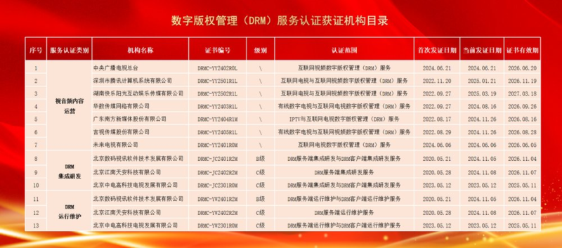 开放、统一、互信的技术生态离不开评估与认证的支撑,国家广播电视总局广播电视科学研究院设计了DRM技术与产品评估机制、数字版权管理(DRM)服务认证规则,有效支撑,和保障TOPLAYDRM正确、合规、有效的产业化应用部署。在服务认证方面,作为国家认监委批准的服务认证机构,广科院面向行业开展数字版权管理(DRM)服务认证工作,保障DRM产品和系统在研发生产、规划设计、集成部署和运行维护等环节标准化和规范化,提升行业视音频内容版权保护能力。截止目前,已有7家机构具备数字版权管理(DRM)视音频内容运营服务资质、3家机构具备DRM集成研发服务资质和DRM运行维护服务资质。
