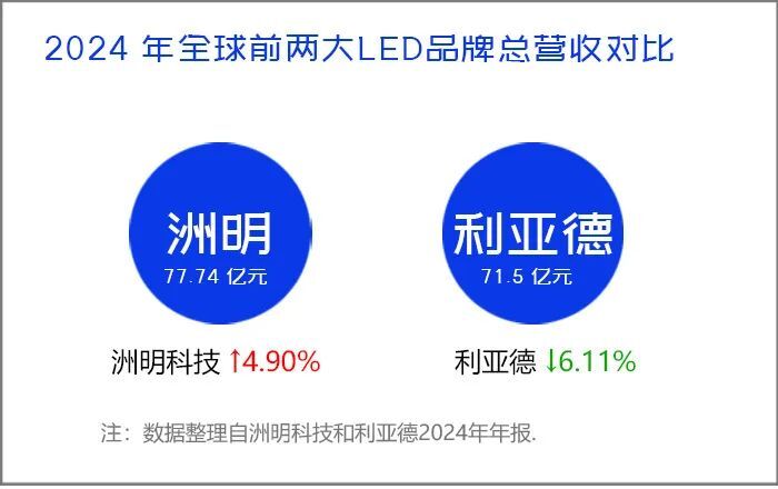 但是,作为全球产业成长的一面旗帜,洲明科技通过加强自主创新、从智造到智创的全面升级,以及在全球市场、生态共生上迈出的坚定步伐,再一次“逆流而上”:其财报数据显示,公司全年实现营收77.74亿元,同比增长4.90%,其中智慧显示业务收入71.90亿元,占比92.49%,海外市场贡献了61.45%的营收,同比增长18.33%。继2023年,智慧显示业务营收登顶全球NO.1后,又一核心经营指标超越利亚德——总营收登顶全球NO.1。