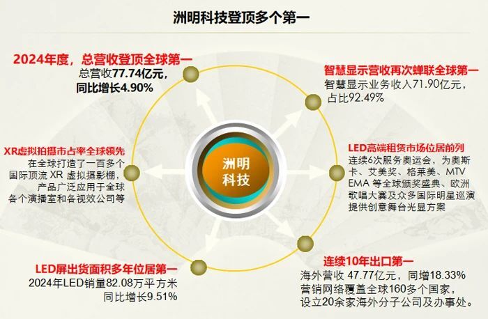 2024年度,洲明科技除了总营收登顶全球NO.1,还蝉联了多个第一:智慧显示营收再次蝉联全球第一、LED屏出货面积多年位居第一、连续10年出口第一。另外,XR虚拟拍摄市场占有率全球领先、LED高端租赁市场位居全球前列。