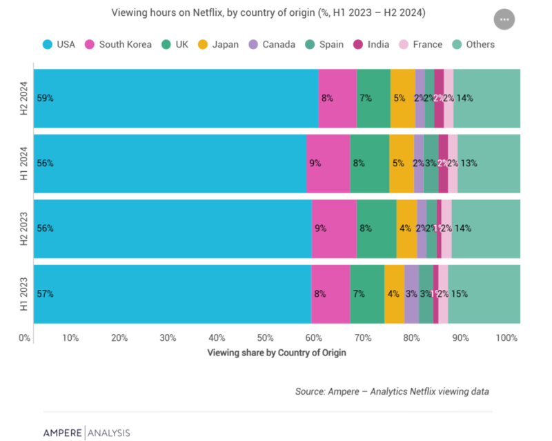 Ampere对Netflix观看数据的分析证实,韩国内容如今已成为全球范围内最广泛输出和收看的内容之一,仅次于美国内容。自2023年以来,韩国内容在Netflix上的总观看时长稳居第二,占平台总观看时长的8%-9%,高于英国内容的7%-8%和日本内容的4%-5%。
