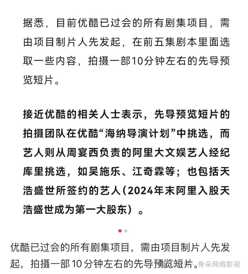 预览片的拍摄团队将在优酷“海纳导演计划”中挑选,艺人则从阿里大文娱艺人经纪库里挑选,也包括天浩盛世所签约的艺人(2024年末阿里入股天浩盛世成为第一大股东)。