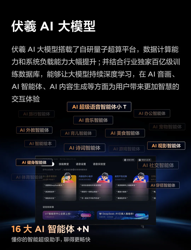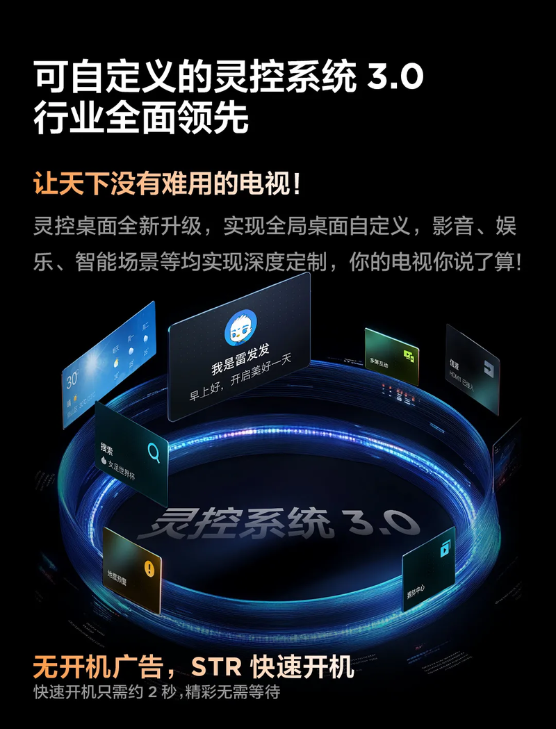 这款新品的系统搭载了我们最新系统——灵控系统3.0,支持自定义卡片式桌面,搭配专属遥控器,实现应用一键直达,让操作更为简单。随着当下AI技术的不断发展,新品不仅通过行业首创的伏羲AI大模型来实现智慧交互,还接入了当下最为火热的DeepSeek-R1来探索AI与智能家电之间的无限可能。灵控桌面将定义权交还用户,伏羲大模型则让内容推荐更智能,让用户拥有一款能够充分自定义的电视系统。