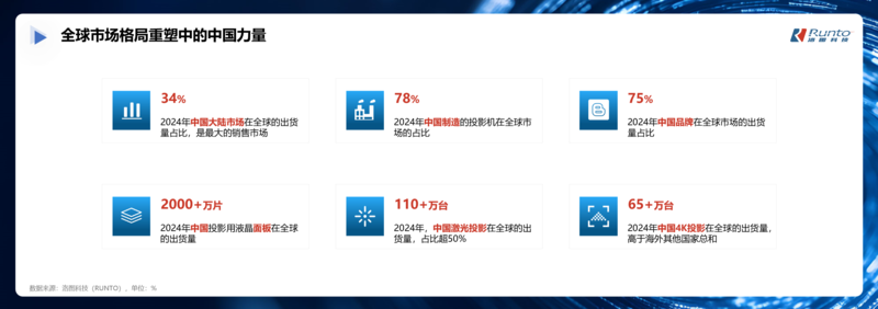 根据洛图科技(RUNTO)数据显示,2024年,在供应链端,中国厂商在投影用液晶面板的出货量超过2000万片,中国制造的投影机在全球市场的占比高达78%;在终端市场,中国大陆在全球市场的出货量占比达到34%,位居第一,中国品牌在全球市场的出货量占比达到了75%;在产品端,中国激光投影机出货量超过110万台,占据全球一半以上的市场份额,4K投影机的出货量更是高于海外其它国家总和。