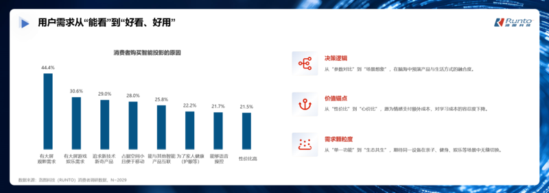 年轻消费群体已经成为中国市场的中坚购买力量,他们更愿意尝鲜、更偏爱个性化、智能化产品。从消费者调研数据看,大屏体验和沉浸感仍是驱使其购买产品的主要因素,但同时易用性、智能化、场景化也成为重要考量因素。