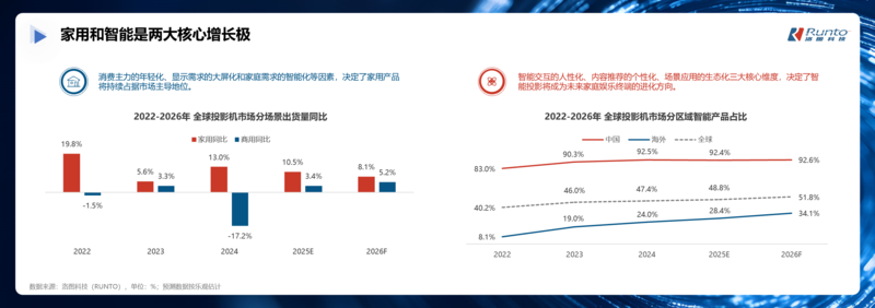 而在行业内部,家用场景的深化和产品智能化浪潮,则是驱动市场发展的两大重要因素。在过去的2024年,全球家用和商用场景呈现了显著分化,家用投影市场的出货量上涨了13.0%,商用市场却下降17.2%。此外,在智能化的渗透率方面,洛图科技(RUNTO)预计到2026年,全球范围内,智能产品的出货量占比将超过50%,其中,中国市场远高于海外市场。