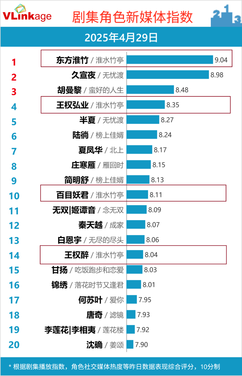 收视持续飘红,自然也少不了剧中魅力十足的角色群像的助力,《淮水竹亭》精准预判了市场兴奋点,主角团没有一个工具人,大家都有血有肉、人设弧光鲜明,能够轻易圈粉网友,并带动作品的讨论度。在Vlinkage角色新媒体指数榜上,更是有四个角色同时进入TOP15,十分的少见,再次印证了该剧在群像塑造上的成功。