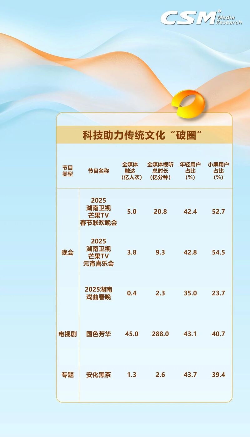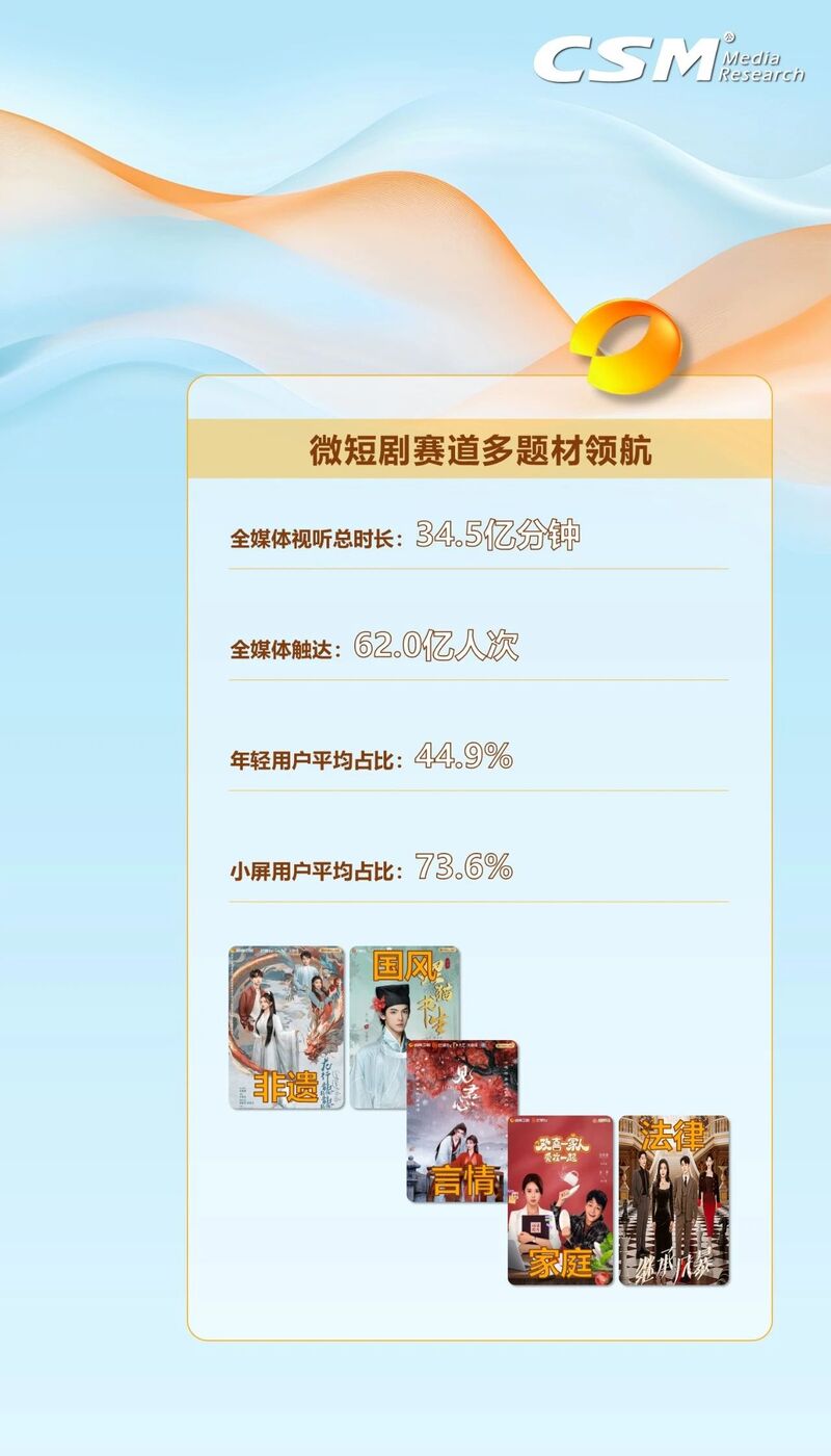 2024年,湖南广电配套“芒果新雨林”养成计划,拿出专项资金扶持“大芒”“风芒”“金色光芒”进入微短剧赛道,开发“短剧+文旅”等模式,成为吸引年轻移动受众的核心抓手。湖南卫视作为微短剧大屏赛道的开拓者和创新者,一季度湖南卫视播出的5部微短剧《龙行龘龘》《欢喜一家人爱在一起》《狸猫书生》《见君心》《继承风暴》将非遗、国风、法律等严肃议题融入娱乐化叙事,降低传播门槛,全媒体触达累计超过62亿人次,全媒体收视总时长超过34.5亿分钟,年轻用户占比平均达44.9%。