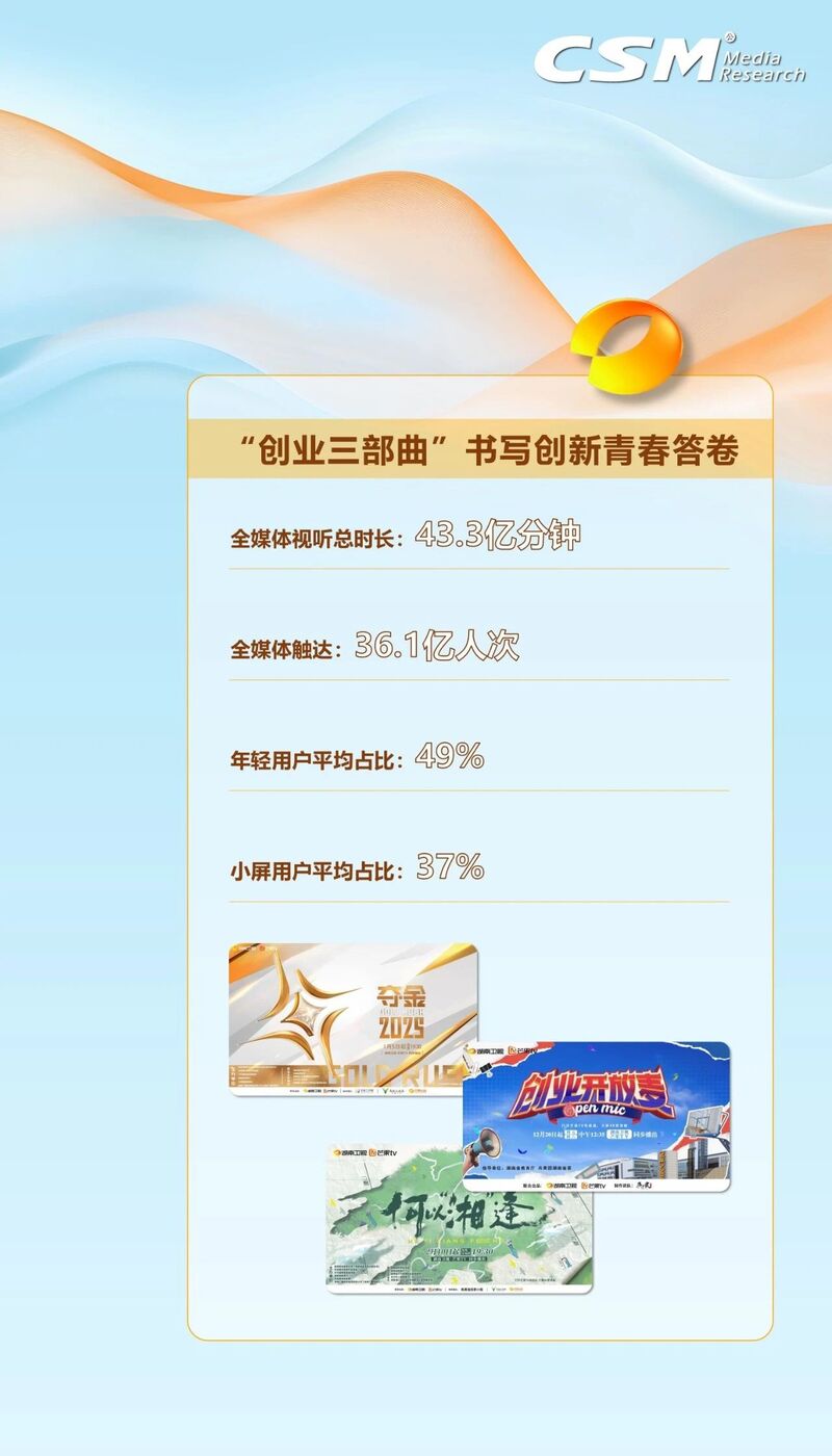 湖南广电2023-2024年度总结表彰暨工作会议中提出:“要做实芒果青年英才计划,让更多95后、00后在“桥头堡”“比武场”抖擞而出,对青年人的挖掘、培养、提拔的措施还要更实,对青年人才机制的创新力度还要加大”。在内容端,创业三部曲激发了大学生的创业热情,书写创新的青春答卷。《创业开放麦》以全国大学生创业新秀为主角,通过脱口秀形式呈现“从实验室到市场”的热血故事,每期“超级股东”送出的创业福利包激发真实创业共鸣,节目作为首档大学生创业脱口秀,在Z世代中掀起“轻创业”讨论热潮。《夺金2025》以爆灯演讲、金种子争夺赛等创新赛制,汇聚博士生、职校生等多元创业者,5年“老牌”创业者与创业“萌新”的故事双线并行。《何以‘湘’逢》则以小体量纪实影像解码湖南创业生态,10位大学生创业者的故事串联起政策扶持、湖湘文化基因等深层密码。三档节目形成“故事分享-竞技成长-生态解读”的完整链条,不仅为创业青年提供资源对接平台,更以“青春化叙事+纪实化表达”让创新精神成为湖南卫视品牌的新注脚。CSM全媒体数据显示,2025年湖南卫视芒果TV“创业三部曲”全媒体触达人次超36亿,年轻观众占比超37%,成为年轻创业者的“精神加油站”。