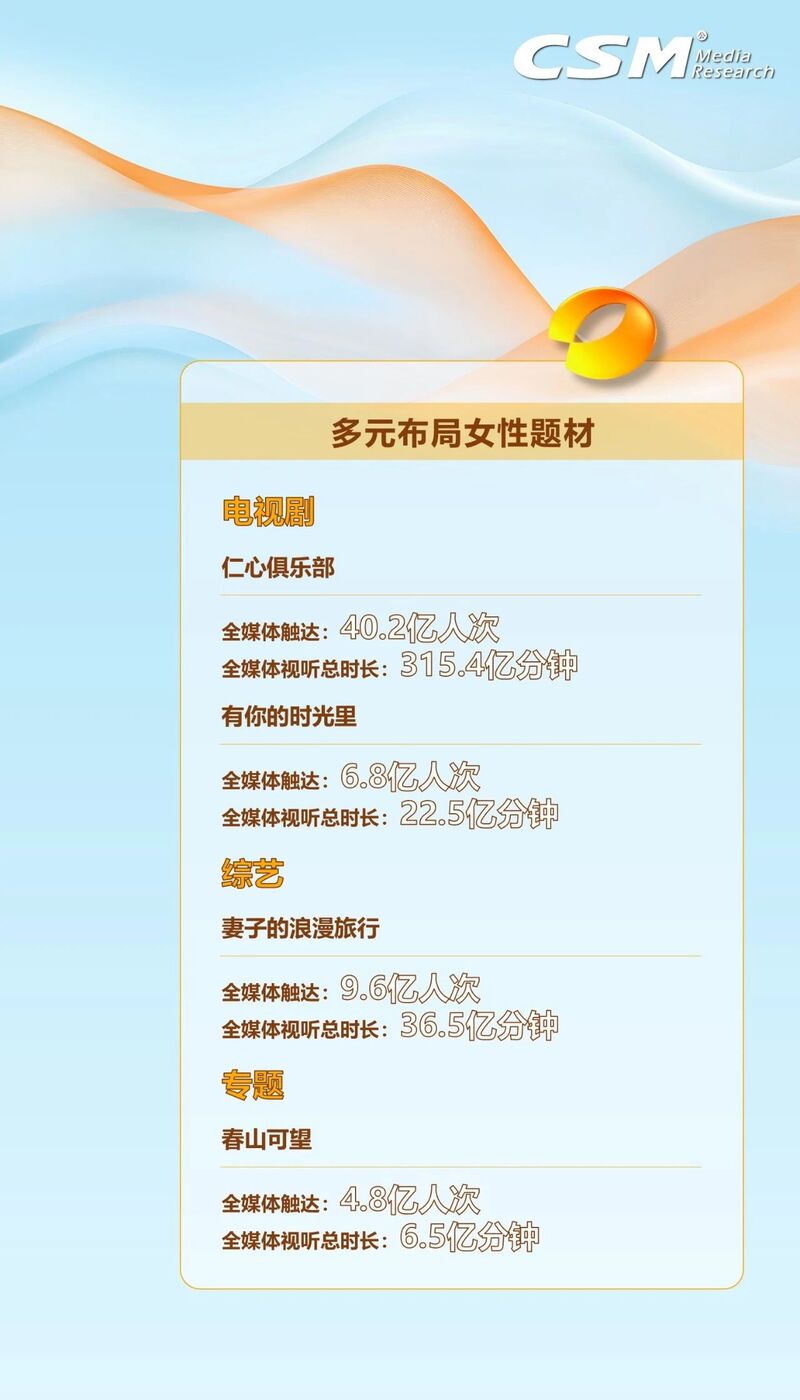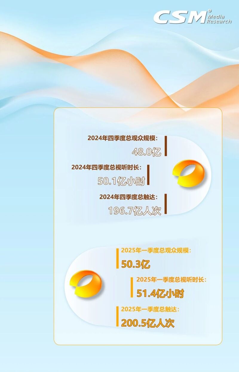 湖南卫视芒果TV以“青春中国”品牌战略为引领,聚焦当代社会发展脉搏,精准锚定女性受众市场,通过多维创新构建特色化内容生态,赢得女性及青年受众群青睐。CSM全媒体数据显示:2025年一季度,湖南卫视总触达超200亿人次,总视听时长3082亿分钟,主要指标较2024年第四季度环比均有增长。