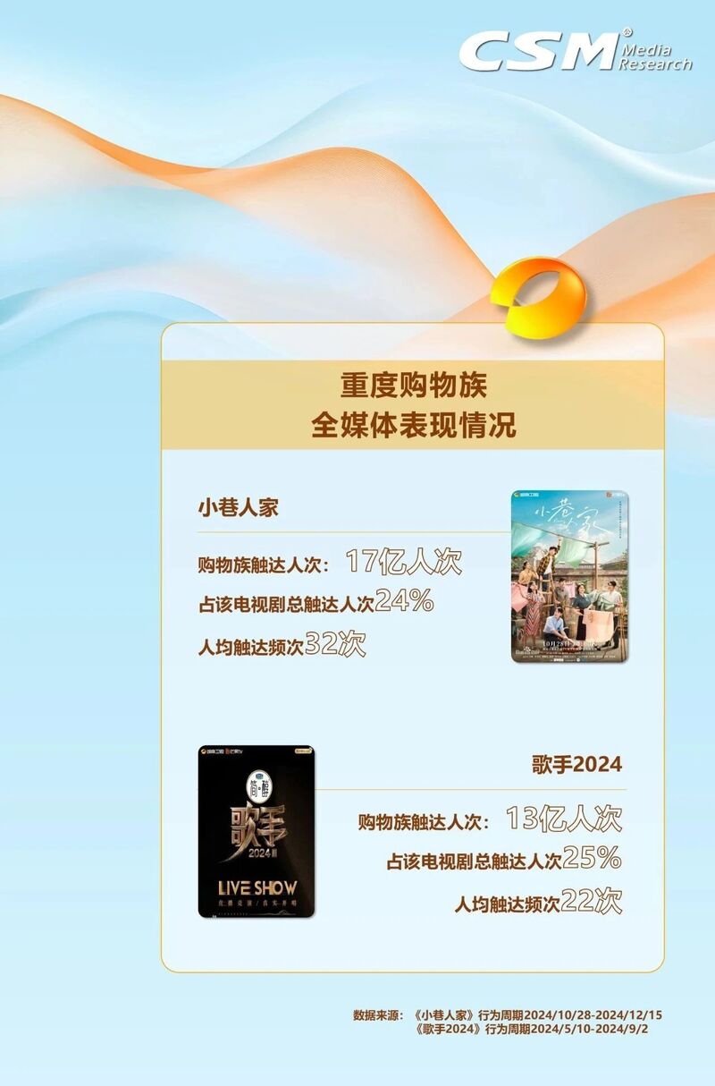大量年轻女性用户的强劲购买力,吸引了天猫投放“2024天猫双11疯狂好六夜”,京东冠名“2024-2025湖南卫视芒果TV跨年晚会”,拼多多冠名“2025年湖南卫视芒果TV元宵喜乐会”,三个最大的电商购物平台,齐聚湖南卫视芒果TV。湖南广电秉持“快乐中国”的核心理念,吸引了众多年轻、女性用户群体,CSM全媒体数据显示,使用电商购物类APP日均占屏时长15分钟及以上的"重度购物族"用户,在多档头部剧综节目表现亮眼:《小巷人家》吸引重度购物族打卡17亿次,人均触达32次,占该电视剧总触达人次的24%;《歌手2024》吸引重度购物族13亿人次,人均触达频次22次,占该综艺节目总触达人次的25%。