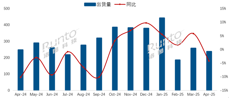 根据洛图科技(RUNTO)发布的《中国电视市场品牌出货月度快报(China TV Market Brand Sell inMonthly Express)》数据显示,2025年4月,中国电视市场品牌整机出货量为236.5万台,同比下降4.3%。