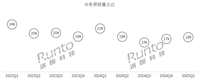 根据洛图科技(RUNTO)线上监测数据显示,2025年第一季度的线上市场中,屏幕的销量渗透率为17.8%,比2024年同期下降了4.5个百分点。