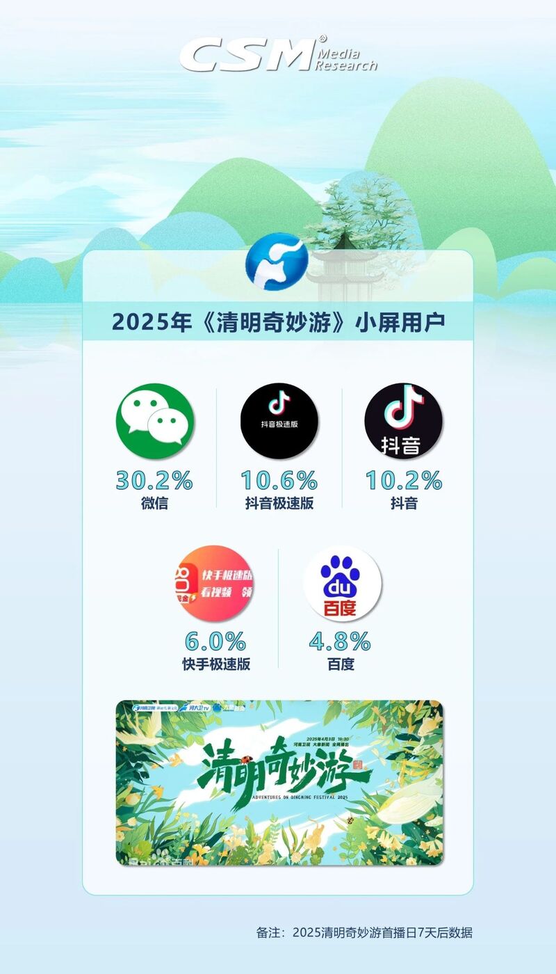 从CSM数据显示,节目首播7天后小屏用户占比高达 71.9%,主要通过微信和抖音平台观看,河南广播电视台通过内容生产流程再造与传播渠道创新,推动“中国节日”系列节目实现从多屏联动到移动优先的战略升级,为传统文化传播开辟出“小屏引领、多屏共振”的新格局。