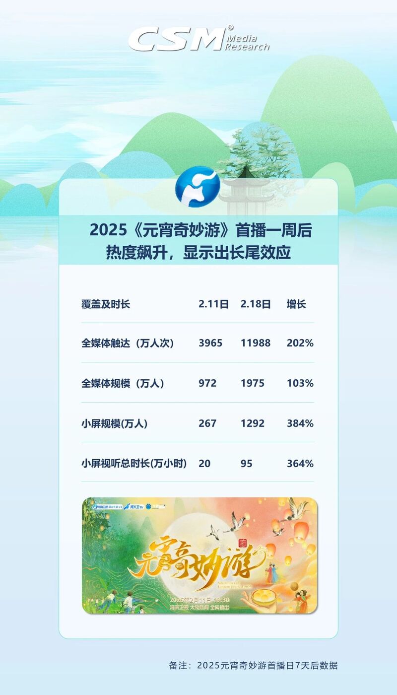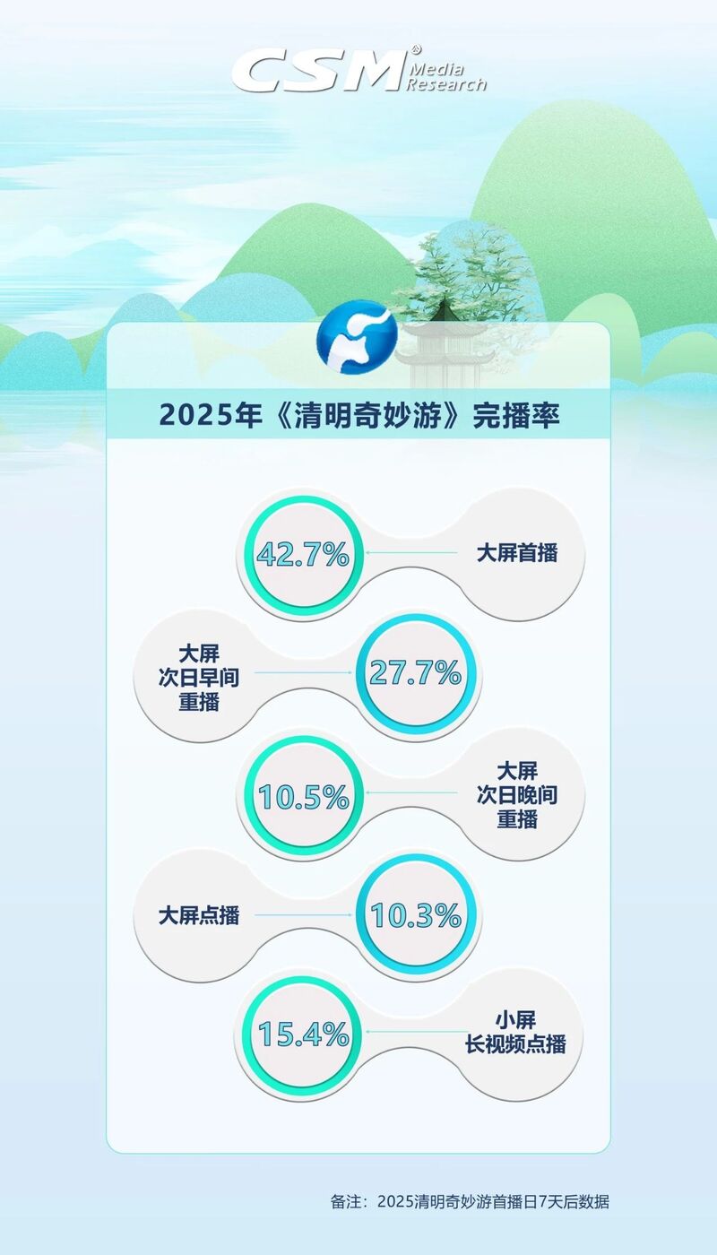 回溯到元宵节,《元宵奇妙游》也用“小屏狂欢”为传统节日的创新发展提供了范例。据CSM数据显示,该节目在首播后引发关注,18.2%的观众选择重复观看,凸显了节目内容的吸引力。在全媒体传播中,移动端收视数据表现亮眼,小屏端用户占比高达65.4%,首播一周后用户规模激增384%,视听总时长增长364%,印证了“移动化传播”的高效渗透力与长尾价值。