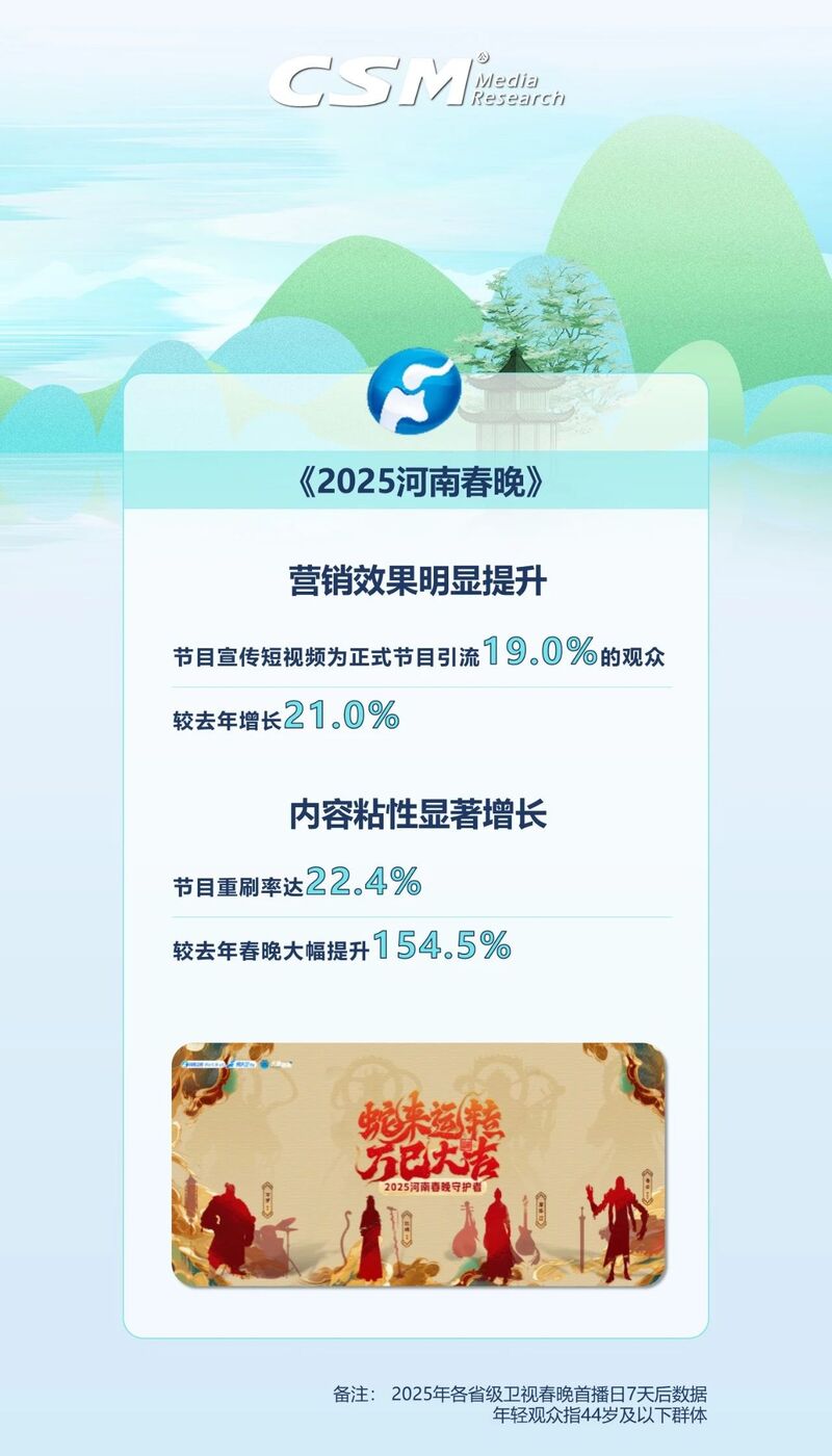 再把时间线往前推移,作为 2025 年蛇年“中国节日”开篇之作的河南春晚,同样展现出中华文化传承与创新的强大生命力。《2025河南春晚蛇来运转万巳大吉》通过“短视频引流+长尾运营”策略激活用户深度参与,在预热阶段发布的宣传短视频为正式节目引流19%的观众,较去年增长21%,这种以轻量化内容撬动流量、以精品正片深化体验的模式,实现了传播广度与内容深度的平衡,更推动“中国节日”IP从文化符号升级为全民参与的文化新生态。
