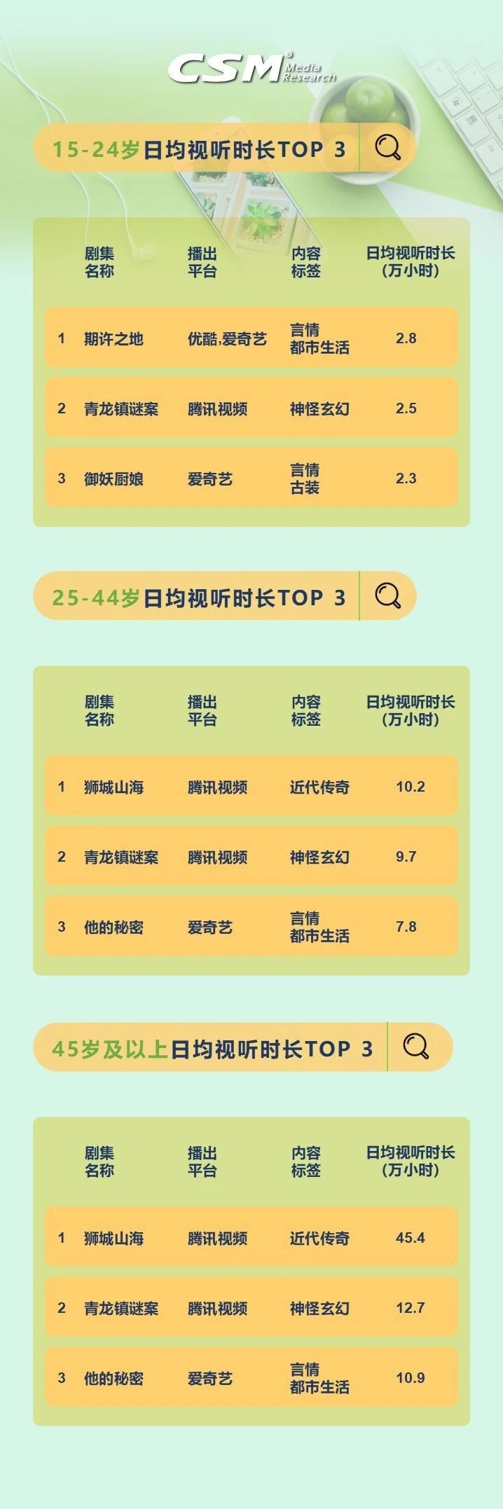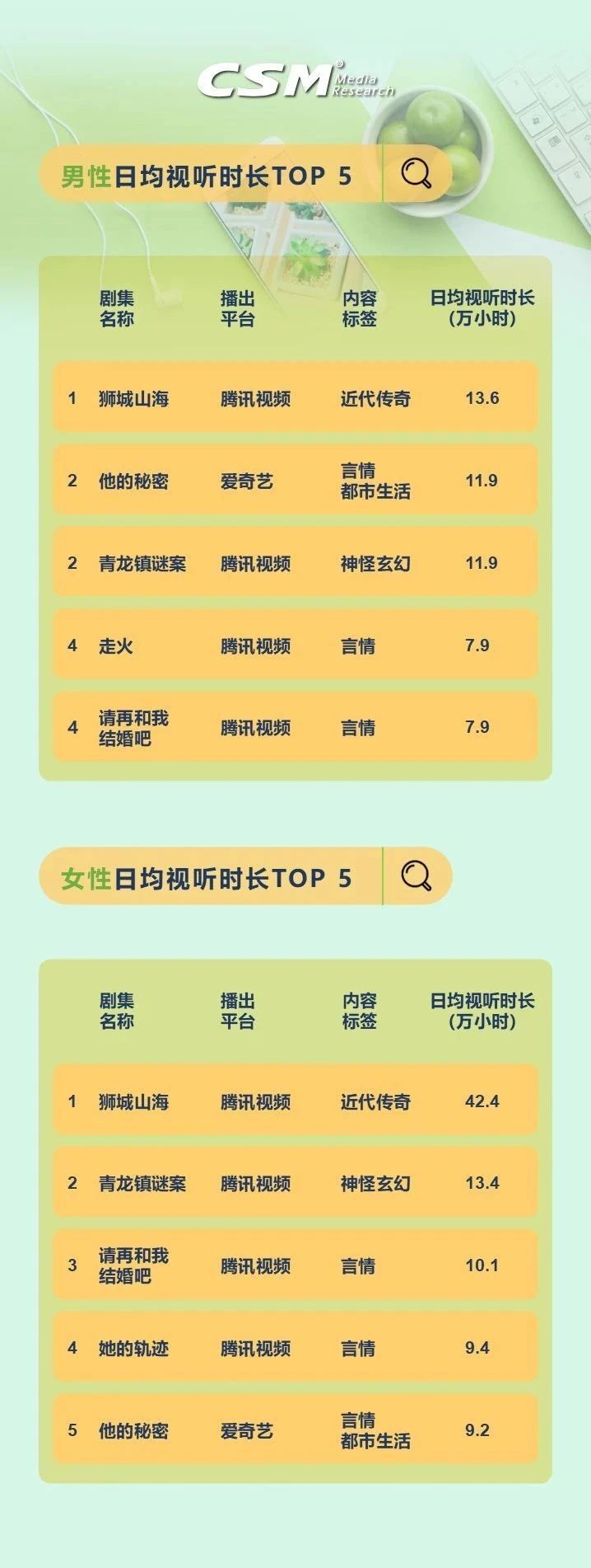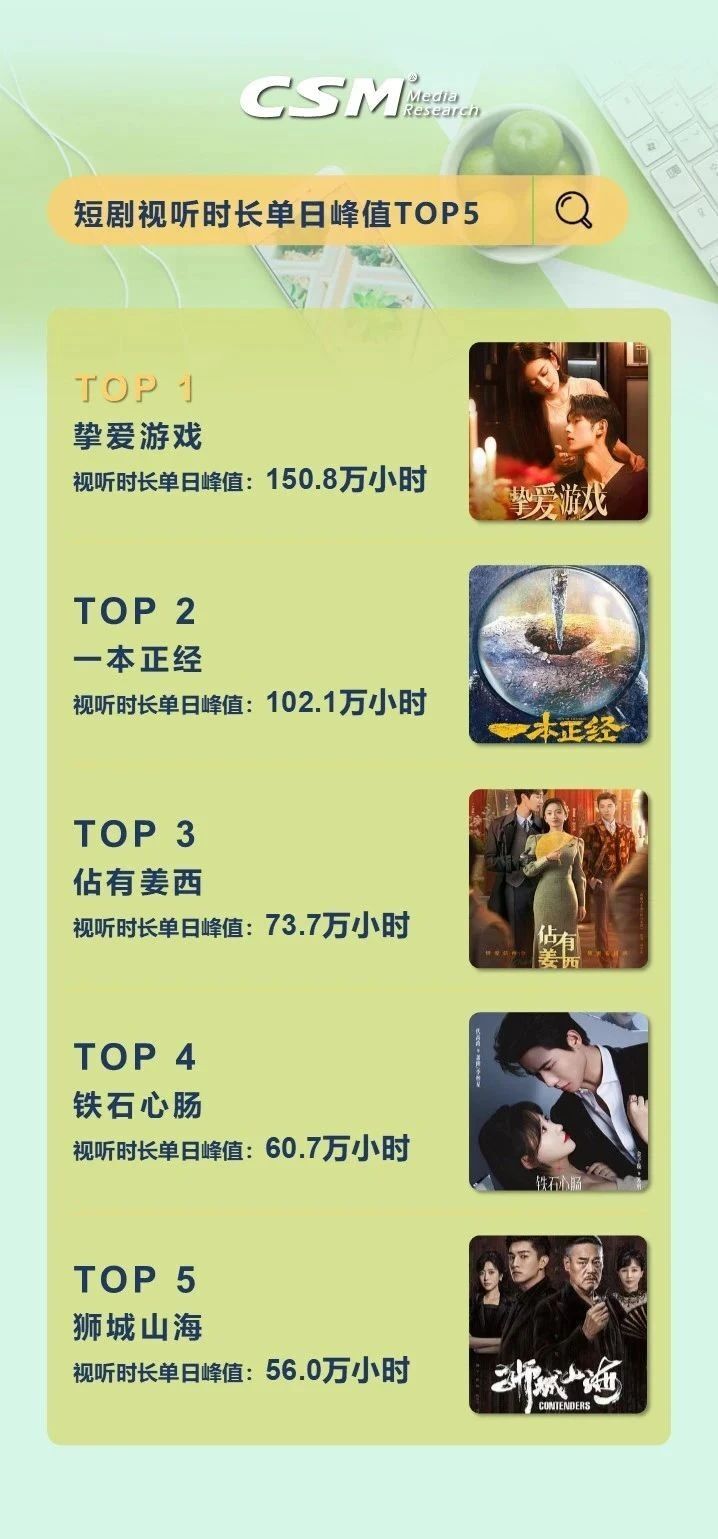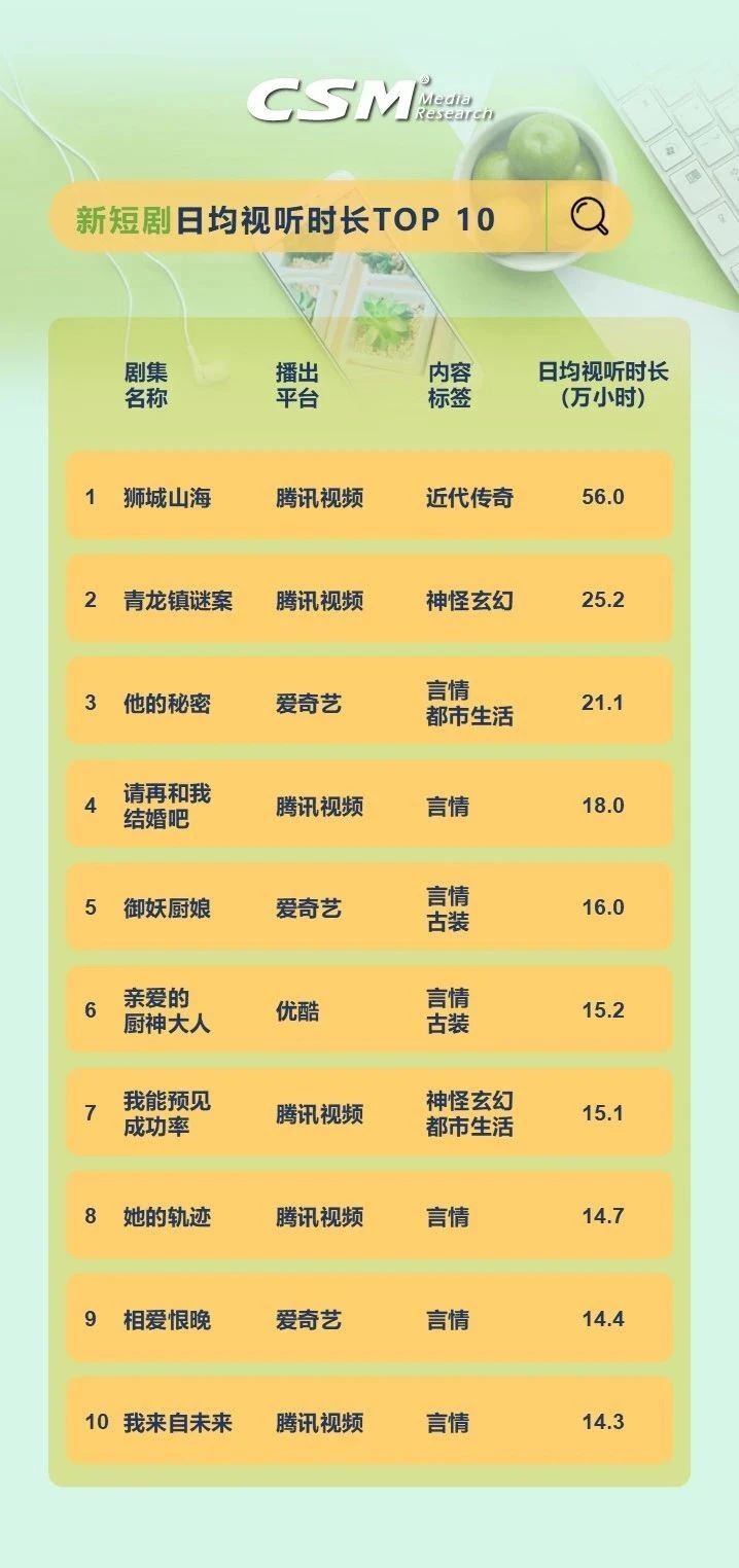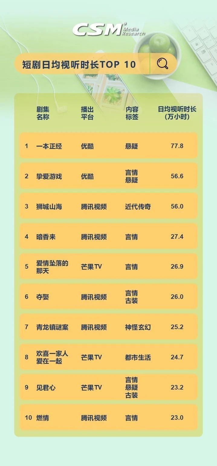 从日均视听时长TOP10的剧集来看,优酷的悬疑剧《一本正经》日均视听时长77.8万小时,在日均视听时长TOP榜登顶; 排在第三位的是腾讯视频的近代传奇剧《狮城山海》,其日均视听时长达56.0万小时,同时也是排名最靠前的当月新剧。