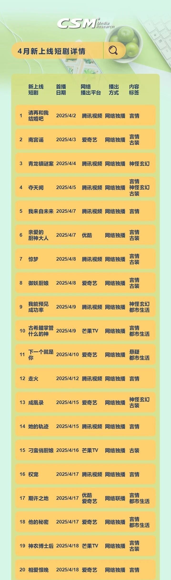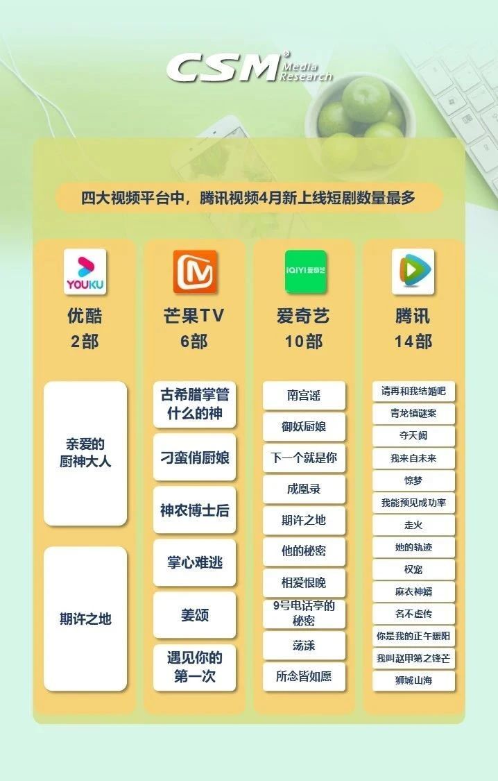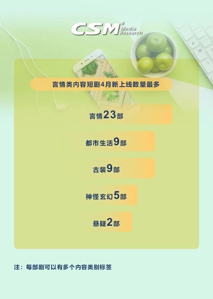 新上线剧集视听总时长达6034万小时,占4月短剧集总视听时长的24%,累计观众触达9.23亿人次。腾讯视频以14部新剧继续领跑;题材方面,言情类内容新上线数量独占鳌头,达23部,都市生活、古装题材各有9部,言情题材依旧是短剧创作的热门选择,契合广大观众对情感故事的追求。新上线的31部短剧共播出602集,平均单集时长12.2分钟,紧凑的剧情和较短的时长符合当下观众碎片化的观看习惯。