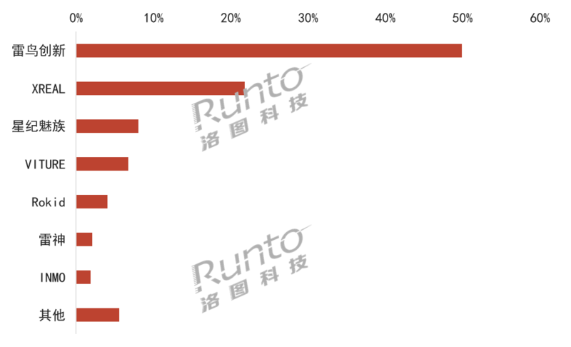 根据洛图科技(RUNTO)线上监测数据显示,在这两类市场中,销量前五品牌分别为雷鸟创新、XREAL、星纪魅族、VITURE和Rokid,市场份额合计超过90%。