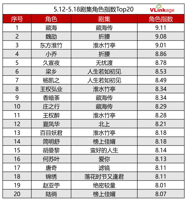 下图为上周剧集角色指数Top20,观众认知度最高的角色为《藏海传》男主藏海和《折腰》男主魏劭,这两部头部大剧均为市场热门题材,自带庞大受众盘,再加上主演均有着强大受众号召力,都是角色能快速出圈的原因。