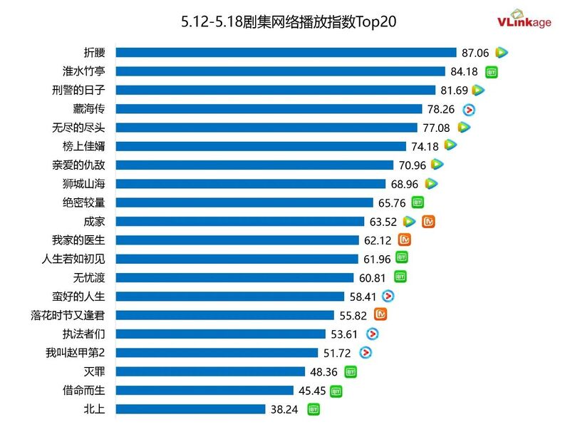 下图为上周剧集网播指数Top20,热度最高的作品为上周新剧《折腰》,网播指数高达87.06。热度居高不下的古偶剧《淮水竹亭》上周依然表现优异,网播指数达到84.18。上周还有一部刑侦悬疑剧《刑警的日子》热度也在80+量级。