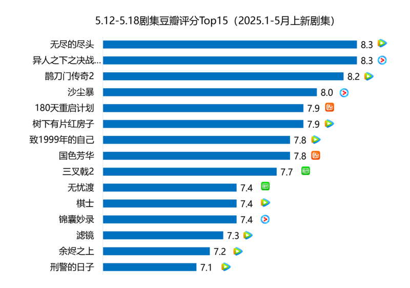 下图为上周剧集豆瓣评分Top15,截止上周,今年有4部作品豆瓣评分在8分以上。上周上榜作品和前一周相比没有变化。