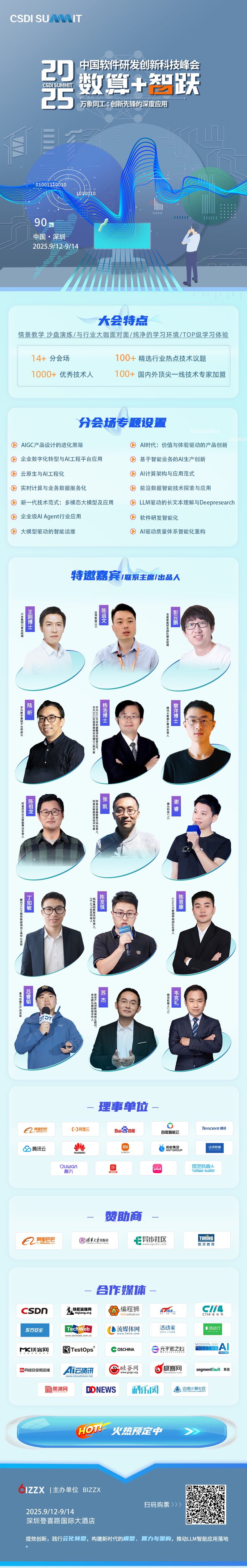 2025CSDI第九届中国软件研发创新科技峰会,将以数算+智跃为主旨,于深圳9月12-14日召开,携手100+国内外顶尖创新先锋,一起推动数字技术引领的智能研发,探寻LLM引发的知识革命下,更多的场景应用实践。