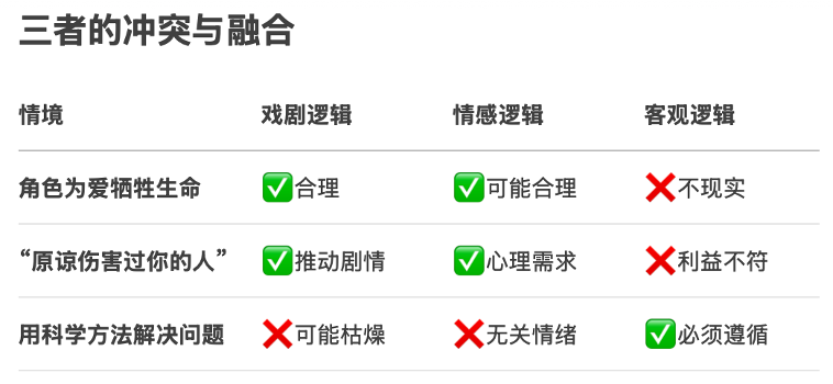 现实逻辑=「事实和数据证明是这样」;情感逻辑=「我倾向于这样是对的」;戏剧逻辑=「故事需要这样才精彩」。当一部戏满足了其中一种逻辑,就「能看」;具备两种逻辑,就能「追看」;三种逻辑同时在线,就是「好看」。