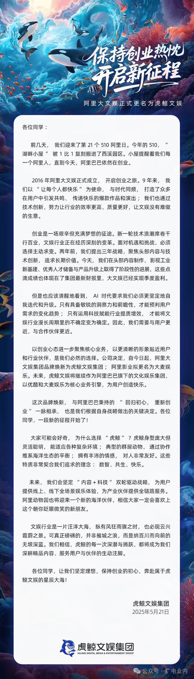 5月21日,阿里大文娱集团宣布即日起更名为虎鲸文娱集团,旗下阿里影业拟更名为大麦娱乐。
