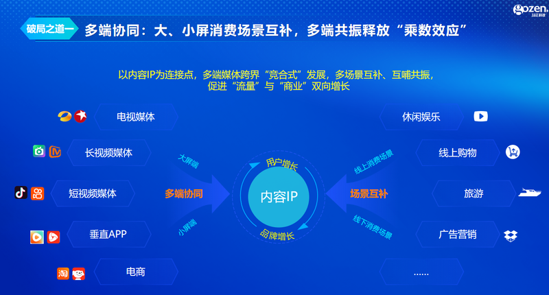 第一点,我们认为无论是IP还是内容,都具有可复制和可共享的特征。以前,我们的IP或内容可能仅局限于某个省份、某个频道或某个电视台,但现在可以通过大小屏的打通,甚至跨多终端进行复制和传播,覆盖更广泛的范围。