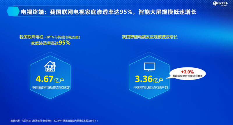 第一,视听总人口已达13亿,基本接近中国总人口规模。第二,移动端手机网民的规模增长已停滞,目前的增长速度仅为1.3%,处于微增长状态。第三,智能电视的家庭渗透率已达95%。上午听到的数据显示,今年智能电视的销售同比下降,这意味着智能大屏领域的用户增长也将进入微增长阶段。而IPTV的用户规模同比增速仅为1.7%。这些数据充分表明,我们的行业已经进入微增长或低增长阶段,用户红利期已经结束,留存下来的只有现有用户。在这种情况下,我们究竟该如何突破当前的困境呢?