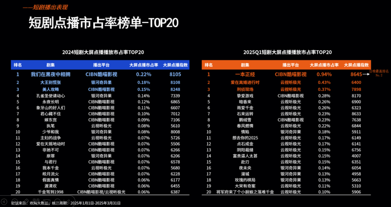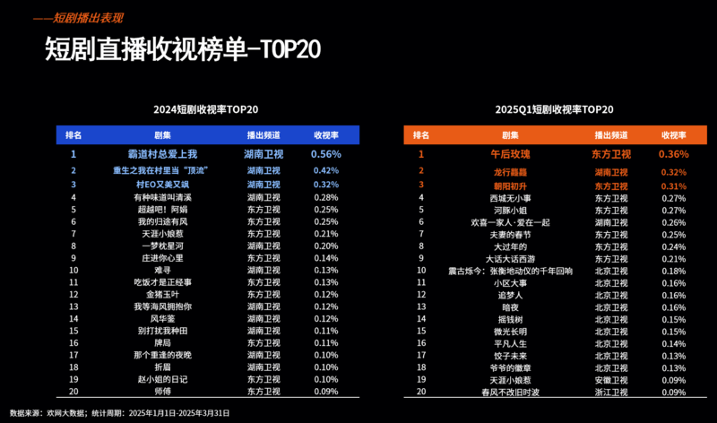 在剧集表现方面,我们快速浏览一下直播和点播的短剧排行榜。首先,在短剧直播收视榜单中,2024年的榜单中的《霸道村总爱上我》和《重生之我在村里当“顶流”》这些剧集都非常接地气,充满了烟火气。而在2025年第一季度上榜短剧类型与2024年截然不同,第一名是东方卫视的《午后玫瑰》,第二名是湖南卫视的《龙行龘龘》,题材更为丰富。点播榜单中,2024年优酷的《我们在黑夜中相拥》在点播榜上表现优异进入榜首,而2025年第一季度的前两名则是《一本正经》《爱在离婚进行时》等剧。