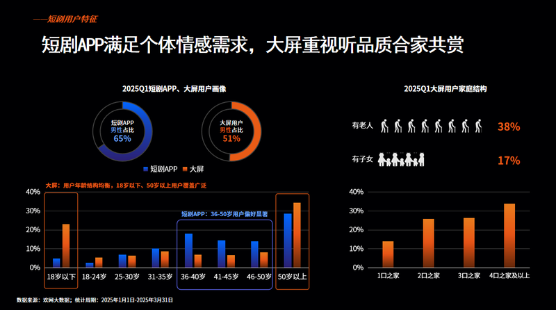 在短剧APP用户画像中,我们发现男性,36岁以上尤其是50岁以上的用户占比较高,他们主要在移动端使用,会利用零散时间观看短剧,并且愿意为短剧充值付费。而在大屏使用场景下,呈现出代际之间合家共享的需求。这就决定了,虽然不同渠道呈现的都是短剧,但短剧内容的本质存在差异。