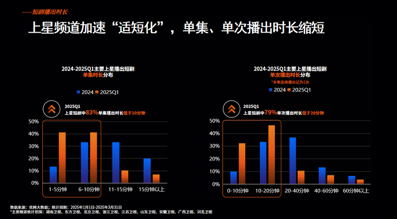 当前,时长在10分钟以内的短剧占比已达到83%。回顾2024年之前的情况,在尝试阶段,推出的内容长度相对较长,比如10至15分钟的剧集在当时占比最高。如今我们来看第一季度单集播出的情况,由于直播场景具有线性播出的特性,高收视需要用户保持粘性并连续停留观看。因此,为了留住用户、维持粘性,各个媒体端都在节目编排上绞尽脑汁。我们可以看到,最初在2024年短剧处于探索尝试阶段时,其时长还努力去迎合栏目的时长标准,比如控制在20至40分钟,尽可能让短剧呈现出栏目化的形态。然而到了2025年,随着对短剧模式的了解和信心的增强,短剧愈发回归自身特色,整体播出时段时长低于20分钟的占比接近80%,编排也更像短剧了。