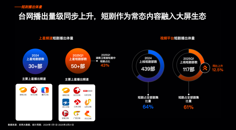 如今,短剧已经进入到了大屏视野。2024,上星短剧部数达到了30+部,2025Q1上星短剧部数50+部,从量级上是颠覆性的提升。电视台对于短剧的认可和信任,已经从数据上体现出来了。视频平台方面,Q1短剧播出体量则同比上升12.5%。