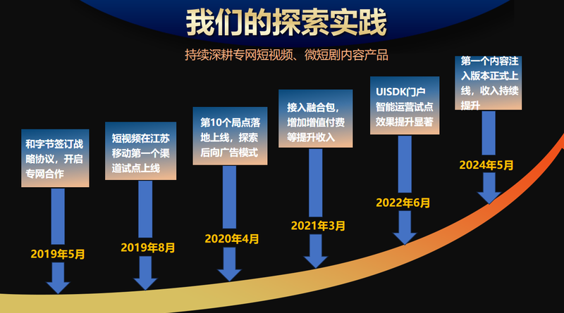 我们公司最早在 2019 年 5 月份与字节跳动达成了战略合作协议,江苏移动是首个试点上线的合作渠道。在发展初期,我们主要采用后向广告变现模式,因为字节跳动本身在公网领域发展,而我们则专注于从专网角度来提升运营和收入。经历去年的行业双治理后,我们转变了模式,直接拿到内容与专网客户开展合作。这样一来,在后续的产品形态上,能够更深入地与大屏上下游进行融合发展。