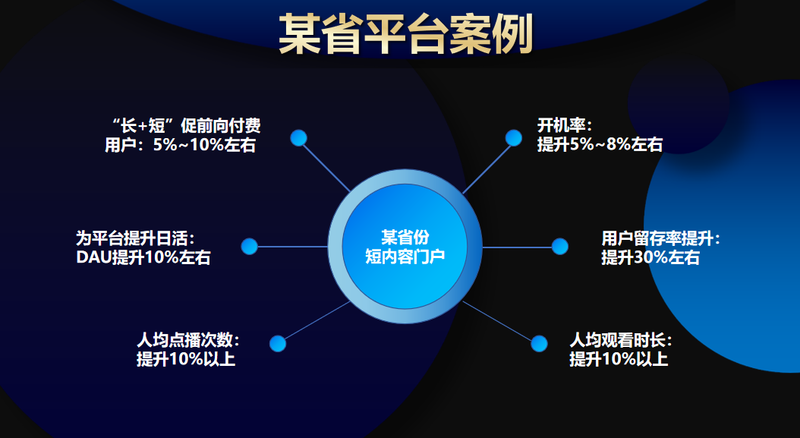 合作落地方面,一种案例主要是以门户的方式来合作,包括保持传统EPG瀑布流风格,最简化集成对接合作。还有一种案例,即开即播,自动播放下一条,实现沉浸式观看体验。我们与某省平台合作后,从前项付费服务的促进、日活的提升、点播的时长等等都有特别明显的提升。