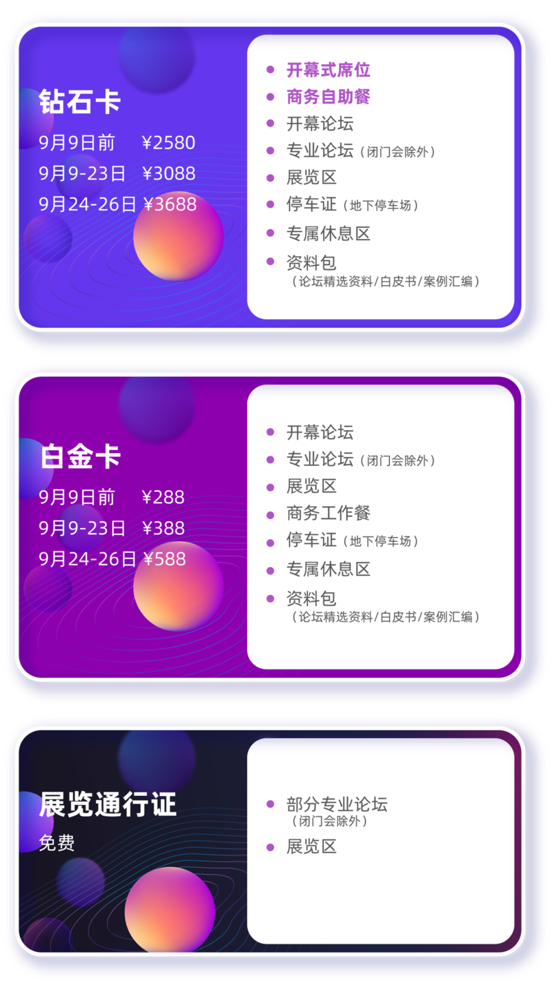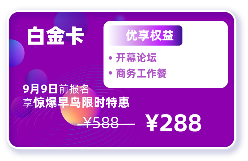 享受商务工作餐,专属休息室,还可以获得“会议论坛公开资料+白皮书+案例汇编”的资料包!
