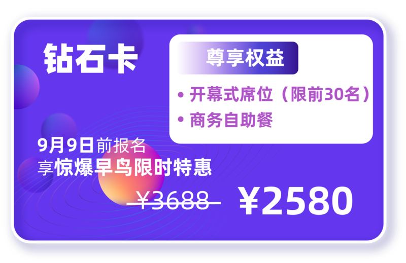 尊享商务自助餐,专属休息室,还可以获得“会议论坛公开资料+白皮书+案例汇编”的资料包!