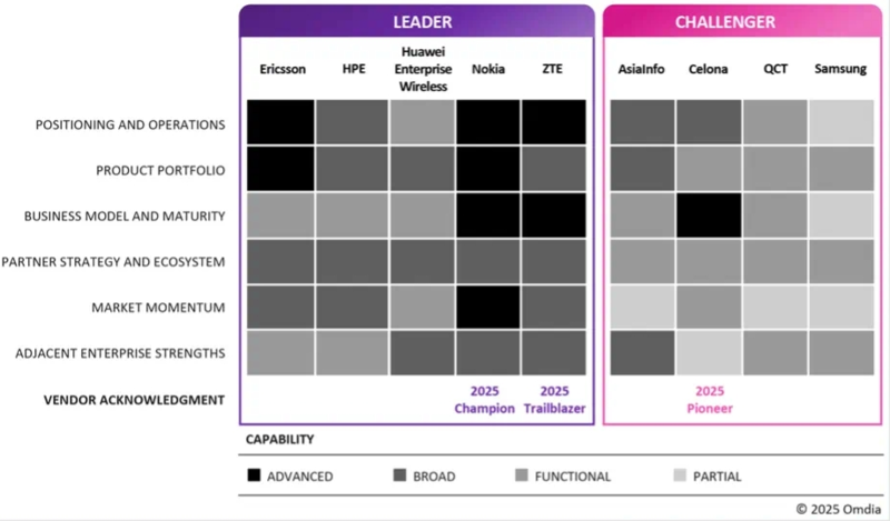 市场研究公司Omdia在一篇新闻稿中写到,该公司针对9家端到端5G专网网络基础设施供应商的最新竞争力评估显示,诺基亚、中兴通讯和爱立信在这一不断发展的市场中处于领先地位。该评估体系综合考量了厂商的技术成熟度、市场投入度以及提供满足各垂直领域企业需求的全栈解决方案的能力。